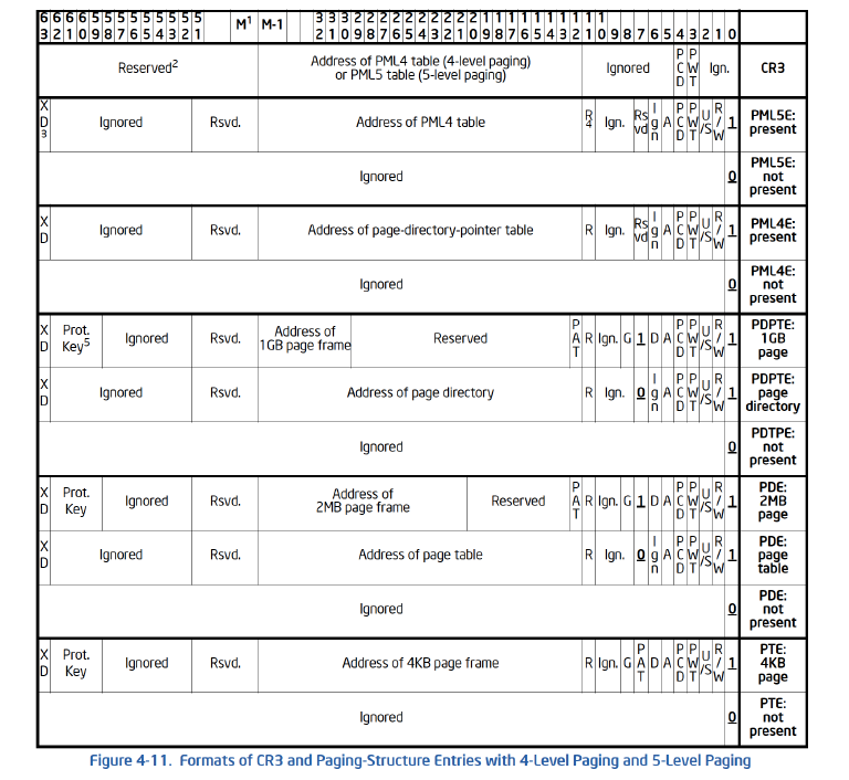 Intel manual, Load CR3 with the physical base address of the Level 4 page map table (PML4) or Level 5 page map table (PML5). ↩︎
